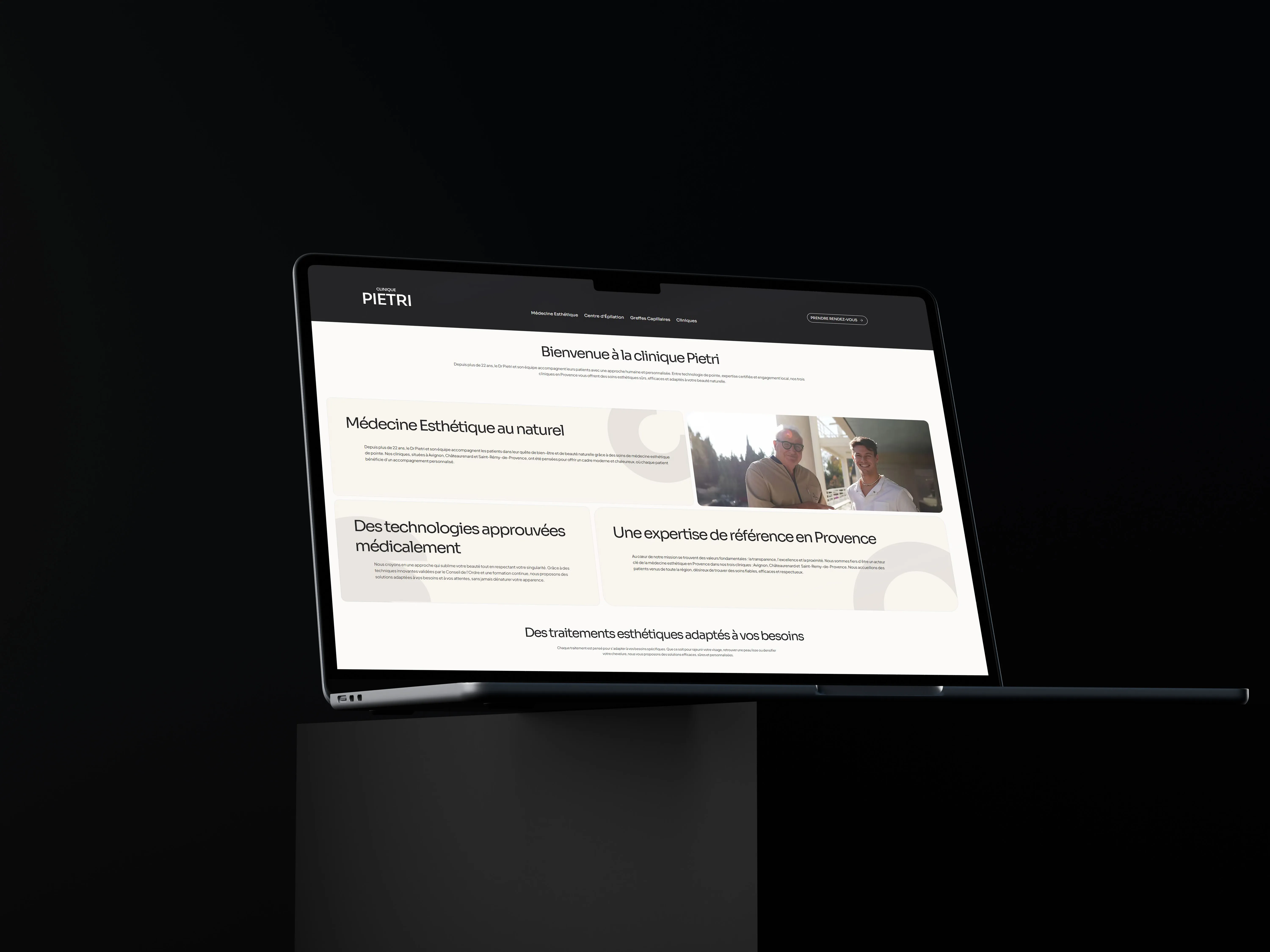 Création du site web de la Clinique Pietri, spécialisée en médecine esthétique en Provence. L’objectif : refléter son expertise, sa transparence et son approche humaine à travers un site clair, moderne et rassurant. Le design met en valeur ses trois établissements, ses services (greffe, laser, injections...) et facilite la prise de rendez-vous en ligne.